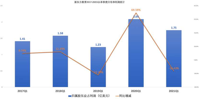 下图载列的是新东方教育2020Q1-2021Q1单季业绩统计:营收和净利润较2020年Q1略微下滑,但整体表现仍然强劲。