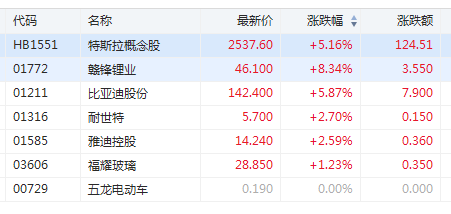 特斯拉概念股拉升 赣锋锂业涨超8%比亚迪涨近6%