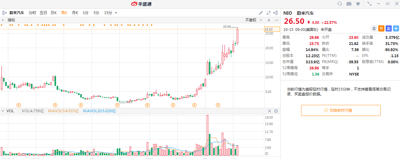 值得一提的是蔚来在2019年10月份,股价一度跌至1.19美元历史最低,这股票在短短的一年多时间里,股价飙涨逾21倍。市值超过357亿美元。蔚来市值已经超过福特汽车、法拉利等,其中福特汽车。蔚来也超过上汽集团市值,成为我国第二大市值汽车股。