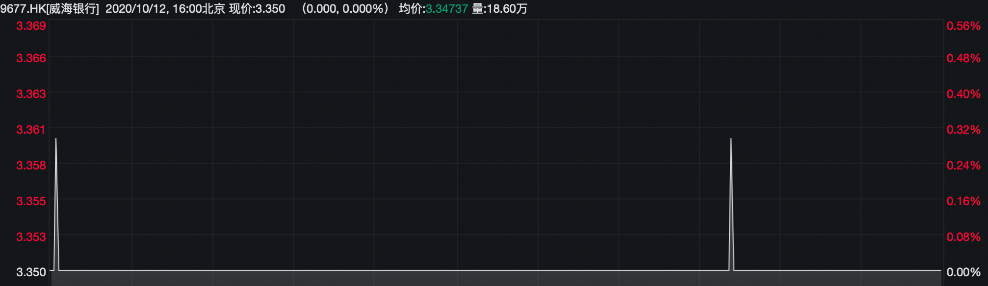 截至10月12日,威海银行收报3.35港元/股,平盘收市。从分时图可以看到,威海银行仅有两个时段出现大单成交,其他时间几乎零成交。