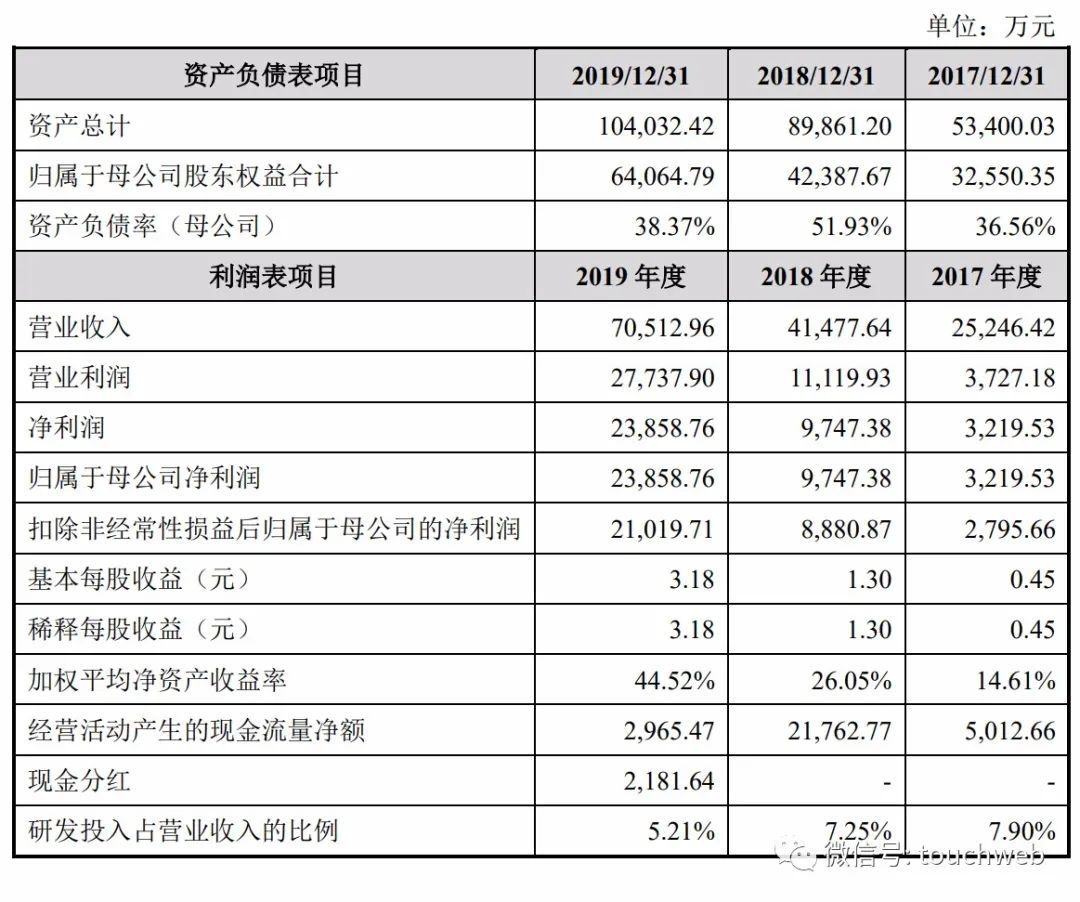 招股书显示,宏力达在2017年、2018年、2019年营收分别为2.5亿元、4.15亿元、7.05亿元;净利润分别为3219.53万元、9747.38万元、2.39亿元。