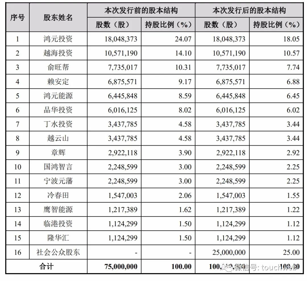IPO前,鸿元投资直接持有公司24.07%的股份;同时,鸿元投资持有鸿元创投96.67%的股权,鸿元创投系鸿元能源的GP,即鸿元能源系鸿元投资所控制的企业,鸿元能源持有公司8.59%的股份;