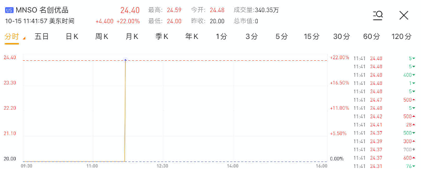 华盛资讯10月15日讯,名创优品今夜挂牌上市,开盘高开逾20%。截止发稿,名创优品涨22.0%,报24.4美元,当前成交量为340.35万。