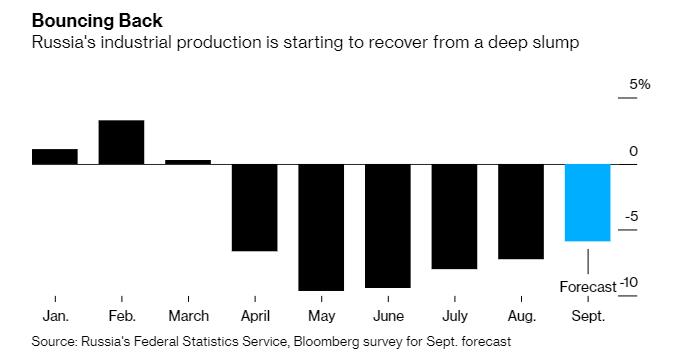 在第二季度的深度衰退后,俄罗斯经济在夏季解除了许多封锁限制后开始反弹。Manturov表示,全年工业生产可能只会收缩4.5%,而制造业将收缩2%。