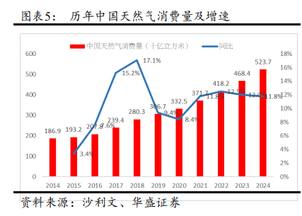 根据国家能源局发布的报告,2019 年天然气占一次能源消费比例为8.1%,较 2010 年提升 4.1 个百分点,但仍低于世界平均的 24.2%,且未来天燃气替代逻辑依旧强劲。根据沙利文报告,预计2024 年中国天然气消费量将达到5237亿方,2020-2024年的复合增长率将达到12%。