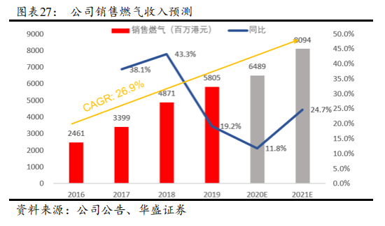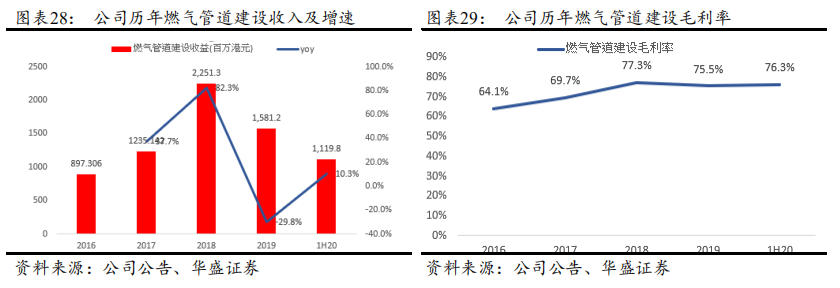 公司燃气管道建设和接驳业务2018/2019/1H20 的收入分别 22.5/15.8/11.2 亿港元,2018/2019/1H20 同比增长 82.3%/-29.8%/10.3%。板块毛利率较为稳定,2018/2019/1H20 分别为 77.3%/75.5%/76.3%。