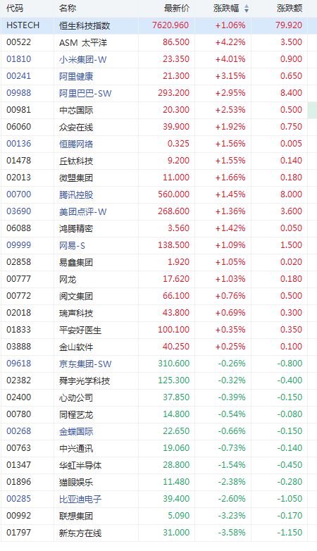 ASM太平洋大涨超4%领涨成分股。小米集团涨超4%,阿里巴巴涨近3%,美团、腾讯涨超1%。