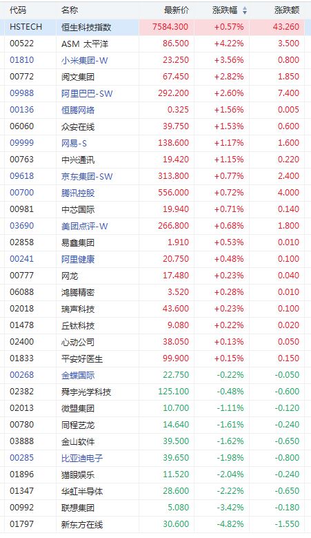 ASM太平洋涨超4%领涨成分股。小米集团涨超3%,阿里巴巴涨2%,网易涨超1%。