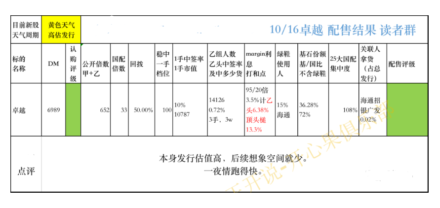 举个例子,嘉和生物首日涨幅16.46%,每手500股,散户每手账面赚1975元。而259张顶头槌首日收益并不理想,假设使用10倍孖展,利息率3%,计息天数8天计算,利息为85138.3元,盈亏平衡价35.35元,即首日涨幅需达到47.3%才可获利。以收市价27.95元计算,每张顶头槌账面可赚29625元,意味着每人亏损5.5万元。主要一个原因是嘉和生物顶头槌太多货不够分,这次卓越商企的顶头槌减少了一半,有109张。