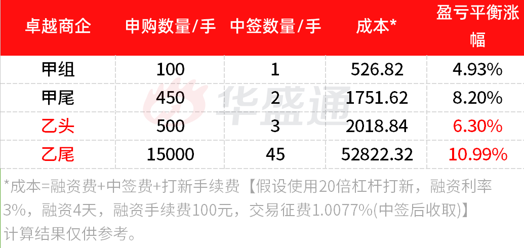 这次卓越商企对大户、散户的分配都比较合理,加上冻资天数比较少,甲组、乙组的盈亏平衡点差距不算大。卓越商企甲组100手涨4.93%以上有钱赚,甲尾涨8.2%以上有钱赚,乙头涨6.3%以上有钱赚,顶头槌涨10.99%以上就有钱赚。
