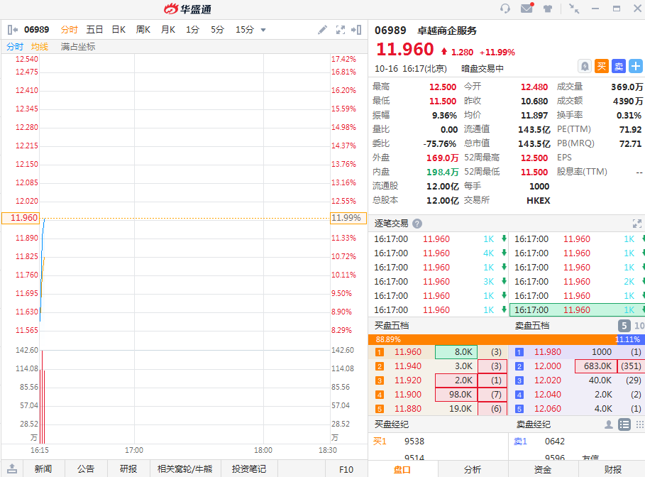 华盛资讯10月16日消息,卓越商企服务(06989.HK)暗盘交易开始,截至16:18报价11.96港元,每手1000股,涨幅11.99%,每手账面赚1280港元,最新市值143.5亿港元。该股公开配售申购人数379873,一手中签率10%,超购倍数约652.06倍。