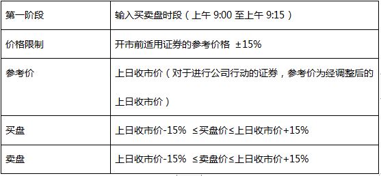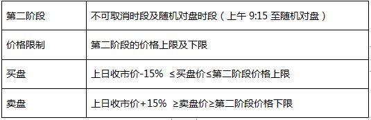 ③若于上午9:15输入买卖盘时段结束时只有买盘或只有沽盘(或两者皆无),第二阶段价格限制将会定制为上日收市价的±15% (即与第一阶段的价格限制相同);
