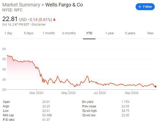 富国银行周五股价一度跌超0.6%,接近5月13日以来的五个月低位,今年迄今累跌超57%,在过去六个月里跑输了KBW大型银行股指数中的其他竞争对手。