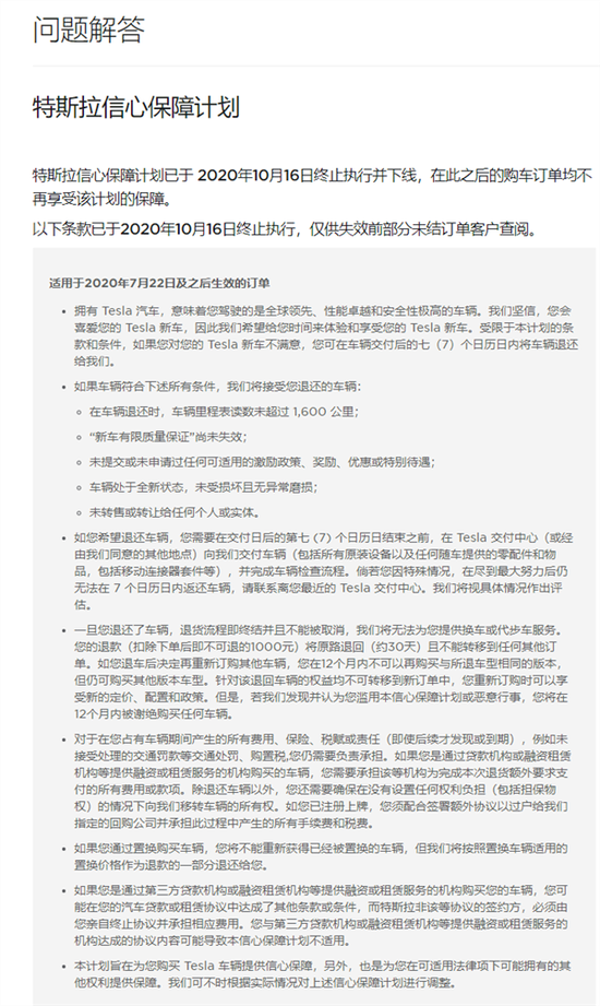 据报道,10月16日特斯拉突然终止执行并下架了特斯拉信心保障计划,以后购车不再享受该政策,意味着消费者购买了特斯拉的电动车不能在7天内随意退还了。