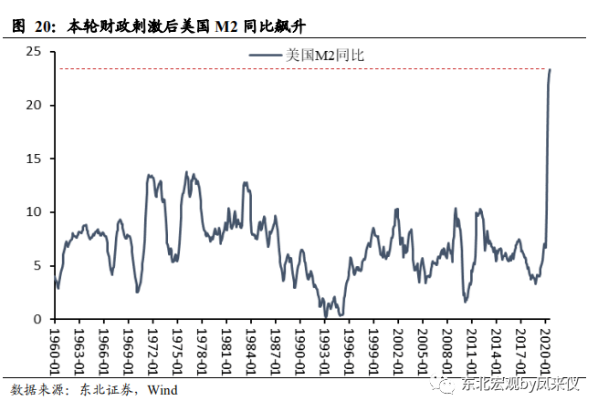 目前美国M2同比增速已经超过23%,远远超出上世纪60年代有该数据统计以来的最高水平。大通胀时期的美国M2同比最高接近15%,金融危机美联储开闸放水后M2同比最高不过10%左右。今年财政刺激对货币传导的效果显著,这是推升未来通胀中枢的核心动力。