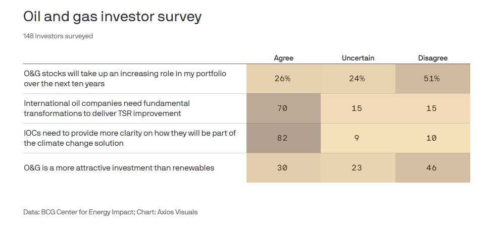 另外,认同“油企需要根本性变革来改善股东总回报”、也需要“更明确说明它们将如何参与气候变化解决方案”的受访者分别高达70%和82%。
