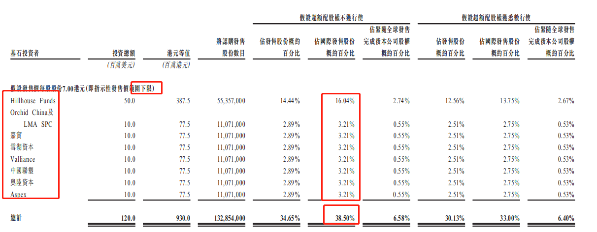 Hillhouse Funds、Orchid China及LMA SPC、嘉实、雪湖资本、Valliance、中国联塑、奥陆资本及Aspex按发售价认购以合计1.2亿美元可购买的若干数目发售股份。按发行价下限计算,基石认购比例占国际发售38.5%。