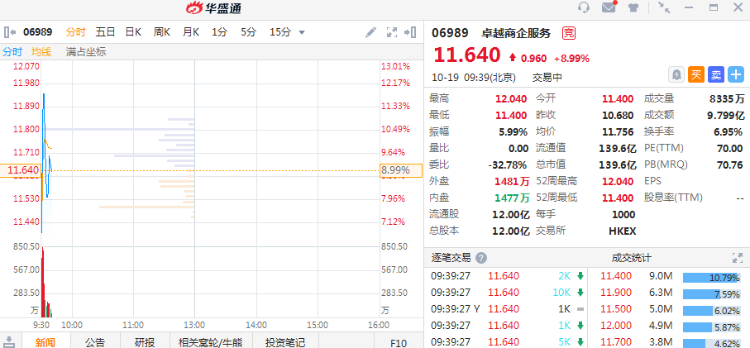 卓越商企服务(06989.HK) 首日挂牌高开高走,一度涨超12.73%,现报11.64港元,较上市价10.68元高8.99%,成交8333万股。