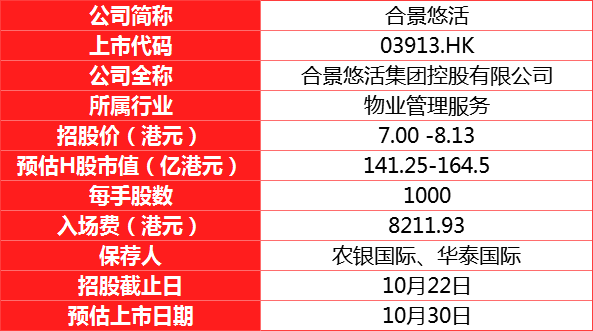 物业服务公司合景悠活发布公告,于2020年10月19日-10月22日招股,合共发售约3.83亿股,招股价每股介乎7元至8.13元,一手1000股计,入场费8211.93元,集资最多31.17亿元,预计10月30日挂牌。农银国际及华泰为联席保荐人。
