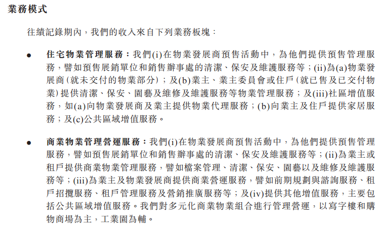 从业务模式来看,合景悠活的住宅物业管理服务板块包括:预售管理服务、物业管理服务及社区增值服务,其中社区增值服务包括向物业发展商及业主提供物业代理服务;向业主及住户提供家居服务;及公共区域增值服务。