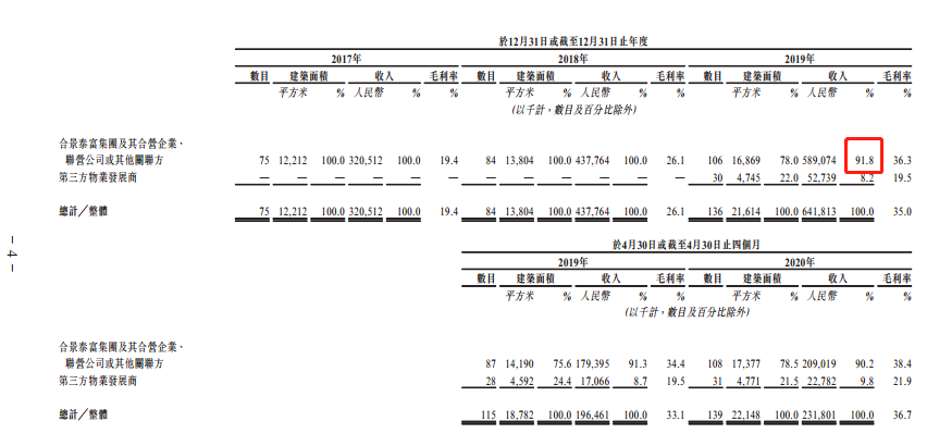 2、绝大部分收入目前来自合景泰富物业开发项目和其合营、联营企业以及关联方