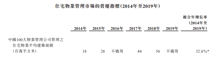 因此,根据中国指数研究院的统计数据,中国住宅物业管理市场的估计市场规模于2019年末达到人民币4,850亿元。中国100大物业管理公司管理的住宅物业的平均建筑面积由2014年的1800万平方米增至2018年的5600万平方米,复合年增长率为32.6%。