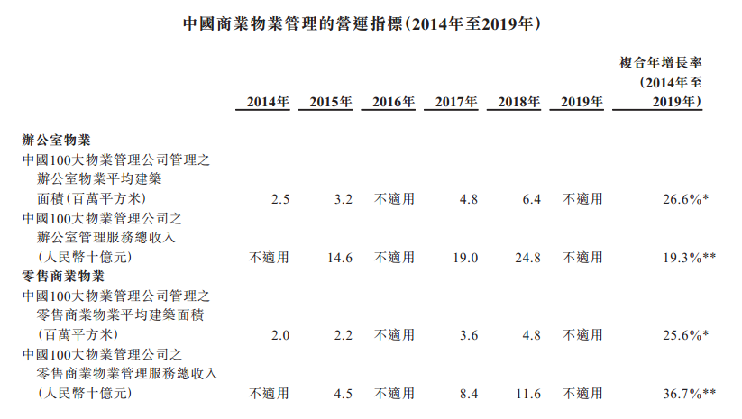 同期,中国100大物业管理公司的零售商业物业管理服务总收入由人民币45亿元上升至人民币116亿元,复合年增长率为36.7%。商业营运公司管理的总建筑面积由2014年2.67亿平方米上升至2019年6.24亿平方米,期内复合年增长率为17.7%。