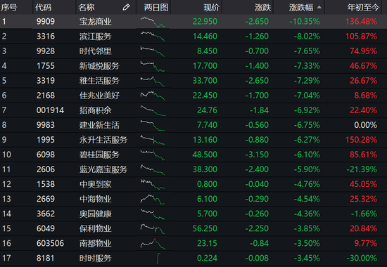 物业股调整不断,今年以来多数股实现翻倍,近期物业股不断走低,其中,宝龙物业暴跌10%,滨江服务跌超8%,时代邻里、新城悦服务、雅生活服务、佳兆业美好跌超7%,建业新生活、永升生活服务、碧桂园服务跌超6%。