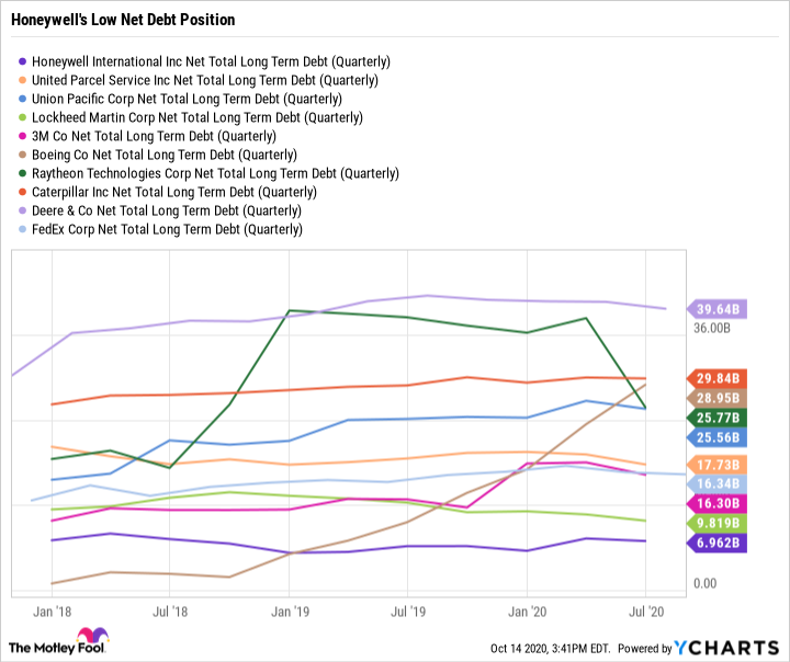这样,霍尼韦尔就可以用额外的现金偿还债务,并保持其健康的资产负债表。尽管霍尼韦尔是美国市值第三大的工业股,但在美国十大工业股中,其净债务头寸最小。