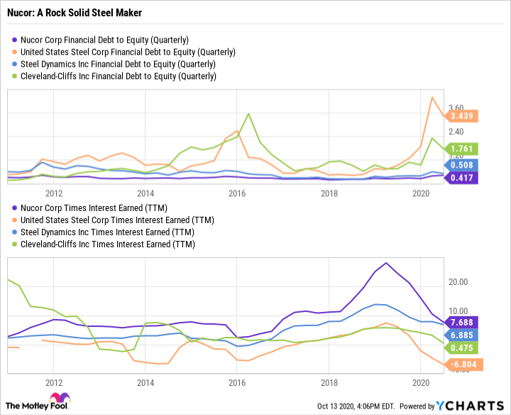 从投资的角度来看,Nucor有47年的年度股息增长历史,目前提供相当慷慨的3.3%的收益率(相比之下,你将从标准普尔500指数基金得到不到2%的收益率)。该银行的金融债务权益比仅为0.4倍,利息覆盖率约为7.5倍,支撑这一偿付的资产负债表坚如磐石。同时,Nucor的现代电弧迷你轧机使其具有比较早的高炉技术,这更容易根据需求进行升降的能力。