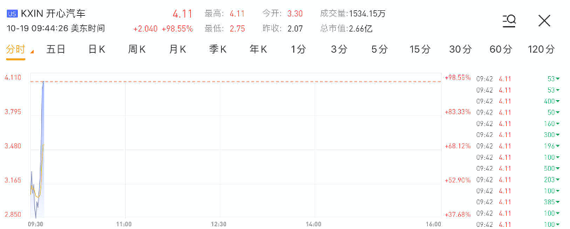 华盛资讯10月19日讯,人人网旗下开心汽车(KXIN)盘中暴涨处罚熔断。截止发稿,开心汽车大涨98.55%,现报4.11美元,该股自10月以来累计升幅已超600%。