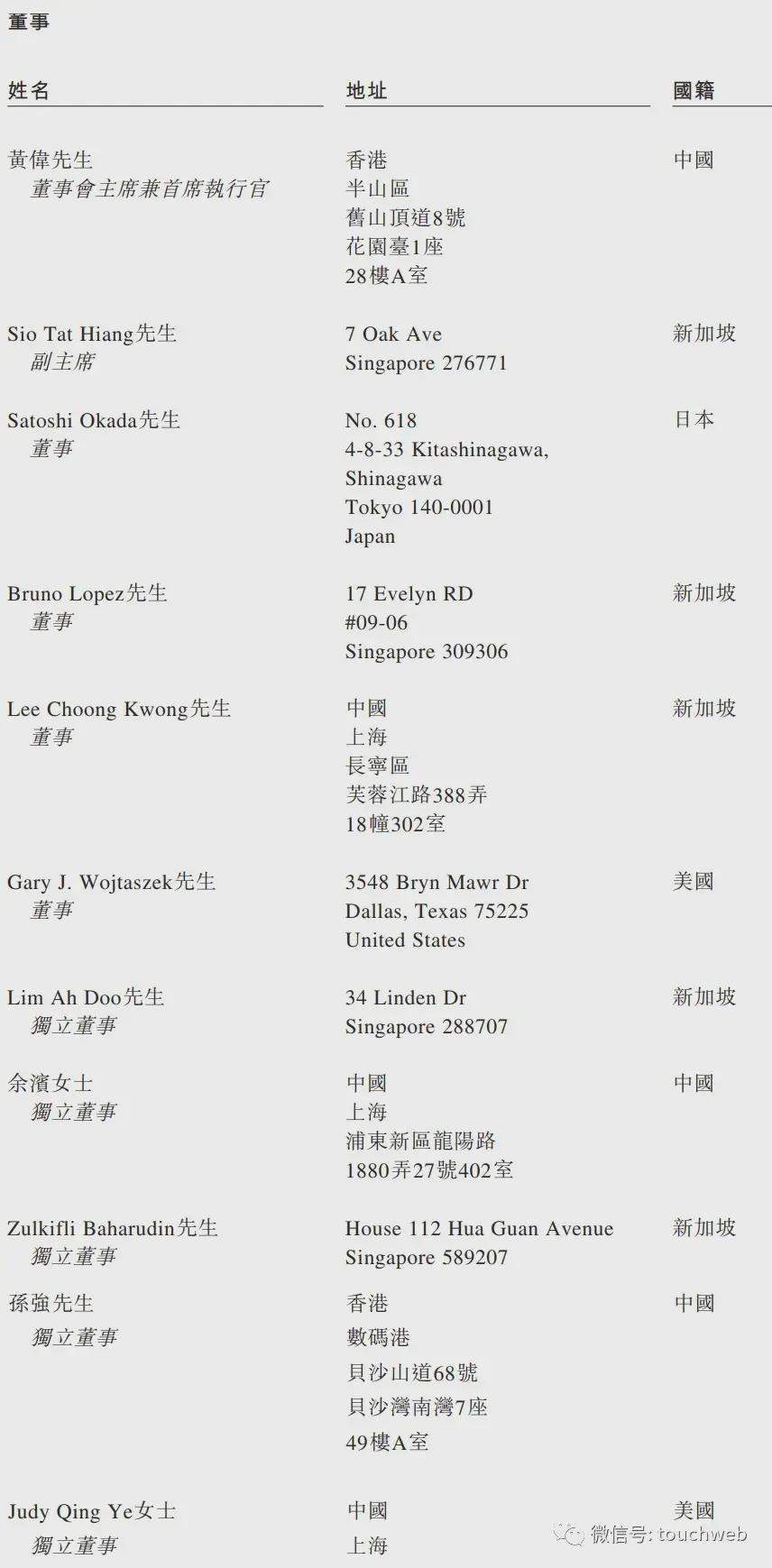 独立董事为Lim Ah Doo、余滨、Zulkifli Baharudin、孙强、Judy Qing Ye。