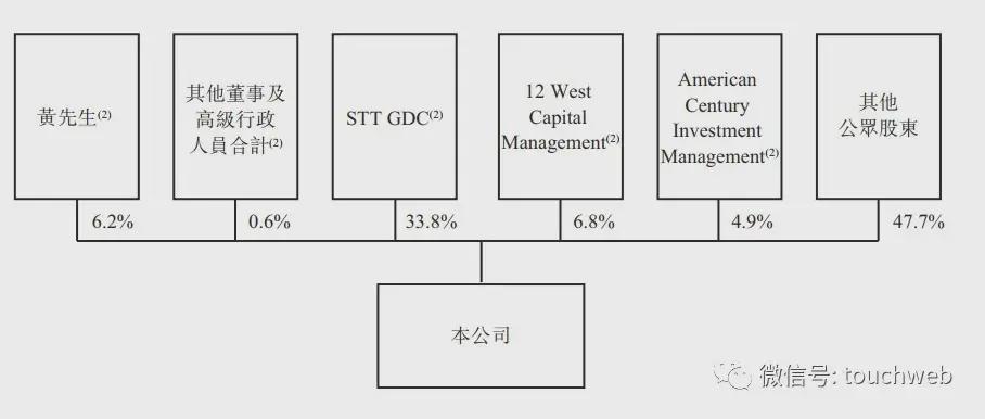 此次在香港上市前,黄伟持股为6.2%,STT GDC持股为33.8;