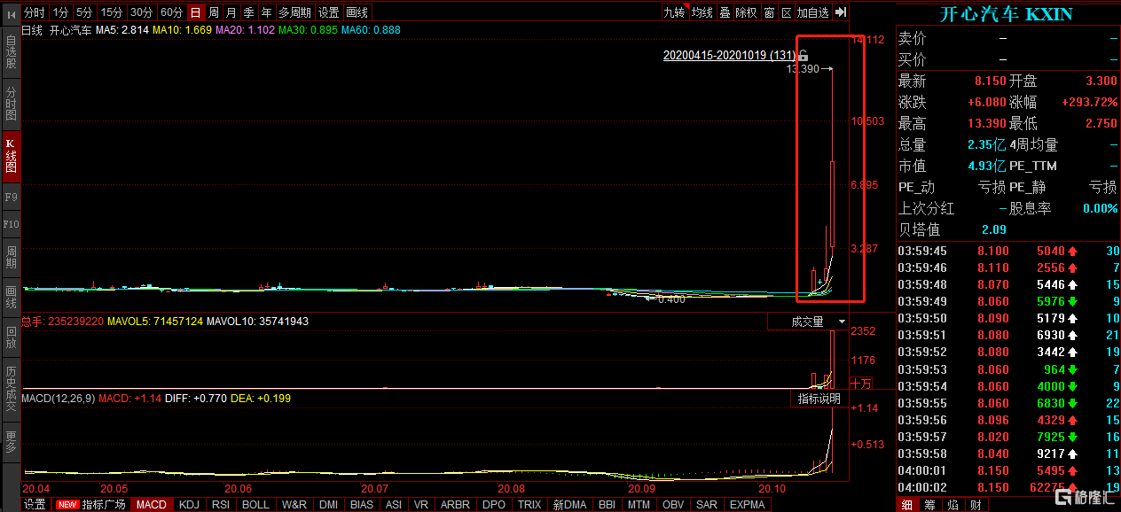 不仅是美股异常火爆,国内沪深汽车板块以及欧洲市场也格外火热。全球新能源汽车板块俨然成为了投资的黄金热点,投资者认为目前包括开心汽车在内的个股有着较低的估值,存在着一定的买入机会。