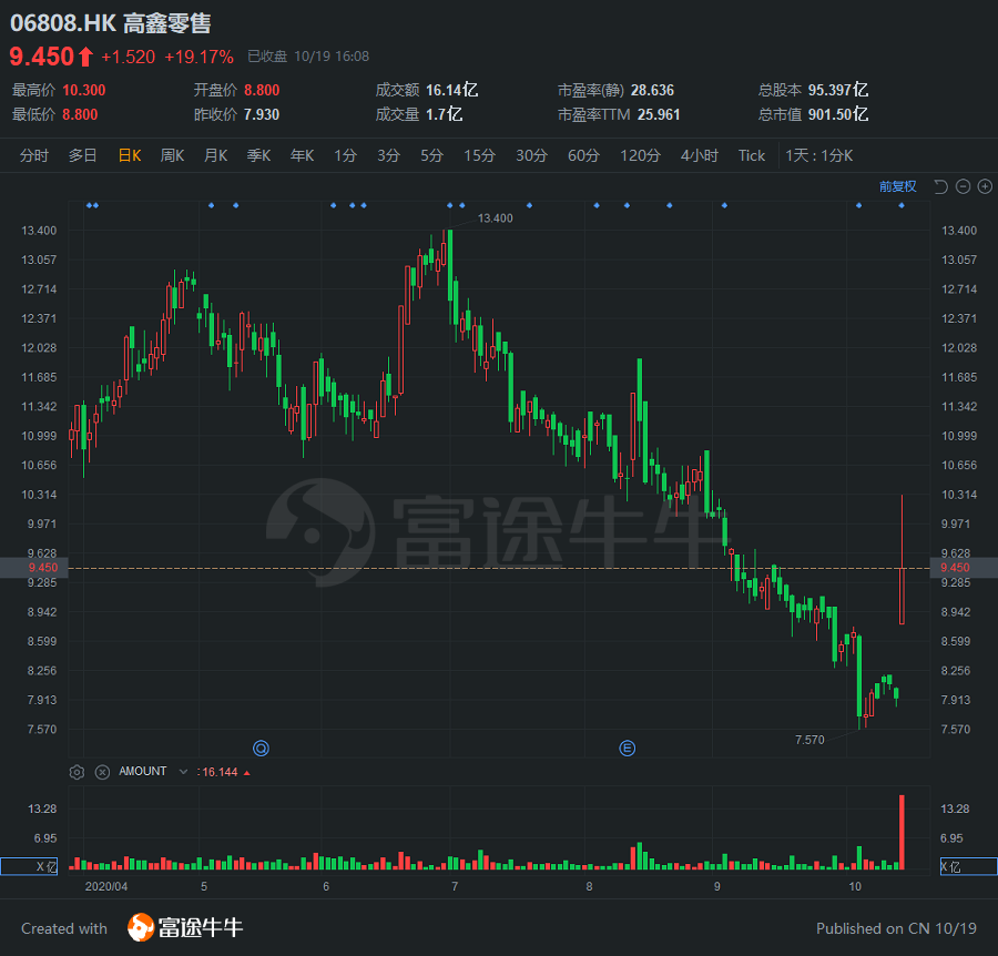 在此之前,高鑫零售股价经历了连续数月的阴跌,7月以来跌幅约40%,并在10月7日以每股7.57港元创下今年以来的新低。