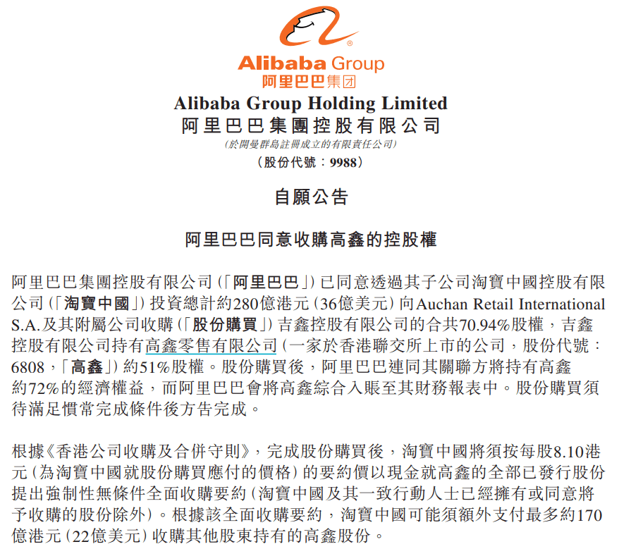 10月19日,高鑫零售和阿里巴巴同时发布公告称,阿里拟投资36亿美元增持高鑫零售股权,从36%增持至约72%,成为控股股东。上午,港股高鑫零售股价开盘一度涨近30%。