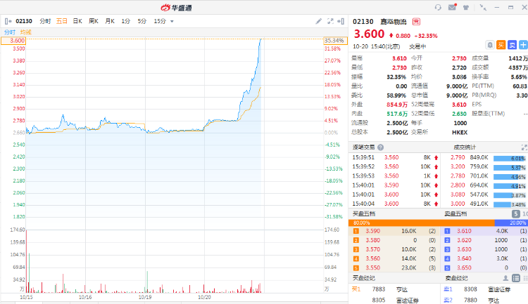 次新股嘉泓物流(02130.HK)午后快速拉涨,现升32.35%,总市值9亿港元。