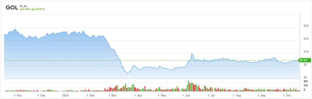 我们从石油行业转向航空业。在当前社会疏远、贸易与旅行限制和中断、经济关闭的环境下,航空公司(即使是廉价航空公司)将面临严重困难,这应该不足为奇。Gol Linhas是巴西主要的低成本航空公司,也是该国第三大航空公司。从今年年初以来GOL股价下跌62%就可以看出航空业面临的困难。