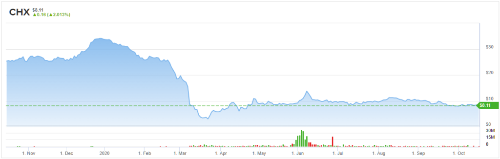接下来的是ChampionX Corporation,一家油田技术公司,在去年夏天通过合并Apergy Corporation和ChampionX Holdings获得了现在的名字。合并后的公司保留了Apergy的交易历史,并采用了新的股票代码CHX。这是一家中游公司,业务涉及石油行业的钻井、生产、管道和水技术领域。在石油市场低迷的情况下,该公司多元化的经营组合给了它很大的回旋余地。