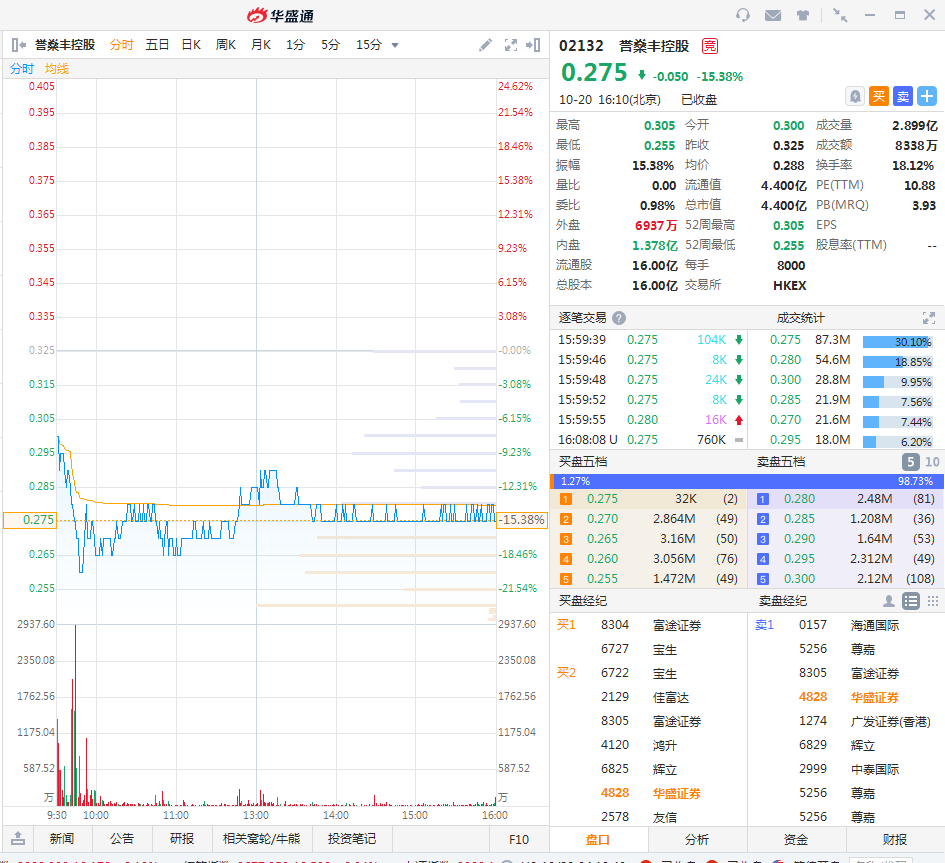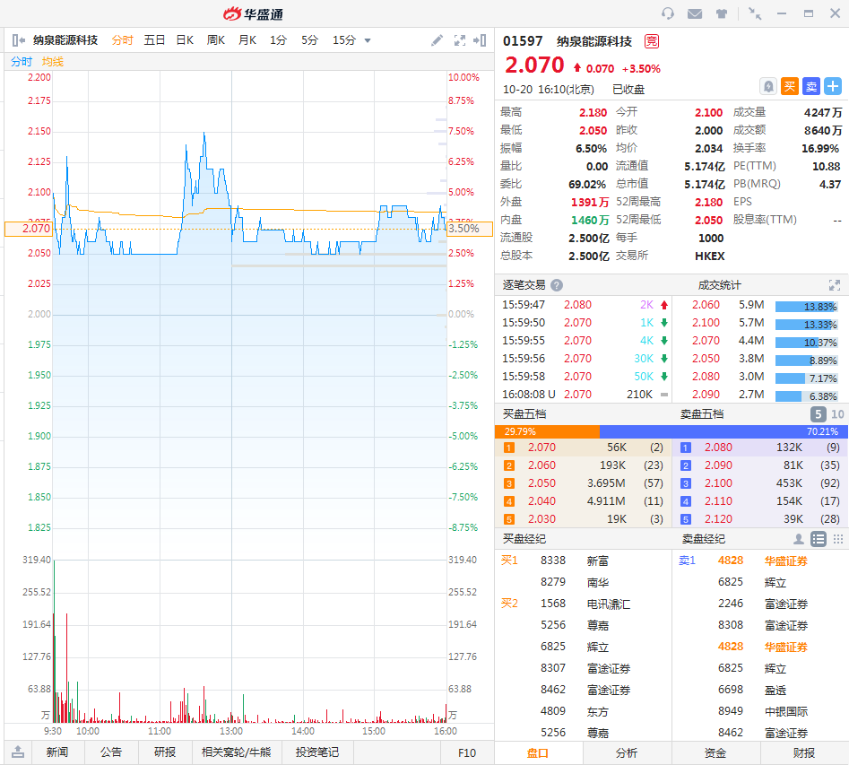 华盛资讯10月20日讯,2只新股今日挂牌,载至收盘,誉燊丰控股(02132.HK)收跌15.38%,全日最高价0.305港元,最低价0.255港元,最新市值4.4亿港元,一手浮亏400港元。纳泉能源科技(01597.HK)收涨3.5%,报价2.07港元,最新总市值5.18亿港元,一手盈利70港元。