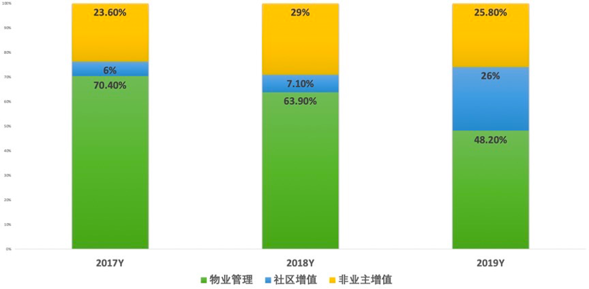 业务收入占比方面,世茂服务的业务收入逐步均衡化。2019年,物业管理、社区增值、非业主增值业务营收占比分别为48.2%、26%和25.8%,其中社区增值服务占比提升快速增长。