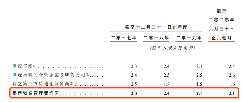 此外,影响公司核心利润的物业管理费在3年来有所下降,整体物业管理费均值从2017年的2.3元每平方米下降至2019年的2.1元每平方米,原因与独立第三方房地产开发商签订的物业管理费下滑较大有关。2020上半年,物业管理费整体水平则基本与2019年底持平。