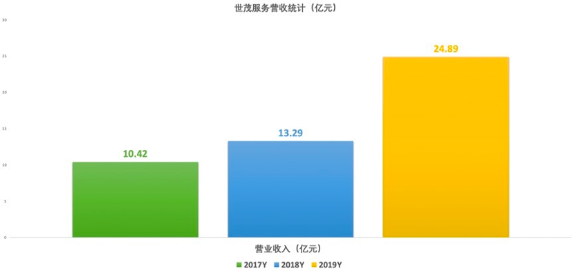 世茂服务的营收和净利润均高速增长。2017-2019年,公司营业收入从10.42亿增至24.89亿元,年复合增长率达到54.55%;同期,净利润从1.08亿增至3.84亿元,年复合增长率高达88.56%。
