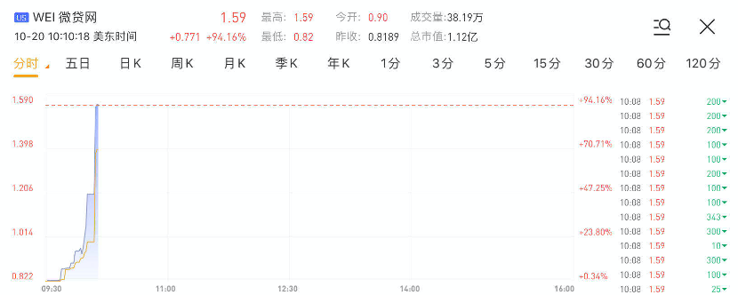 华盛资讯10月20日讯,微贷网盘中大涨。截止发稿,微贷网大涨94.16%,报1.59美元,当前总市值1.12亿美元,成交量为38.19万美元。