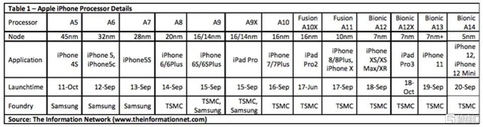在2019年,台积电收入的近50%来自苹果和其他移动提供商。如表1所示,台积电多年来一直在逐步缩小其工艺,从iPhone 7的16nm A10芯片到iPhone 11的7nm A13芯片。iPhone 12机型预计将使用5nm A14芯片。
