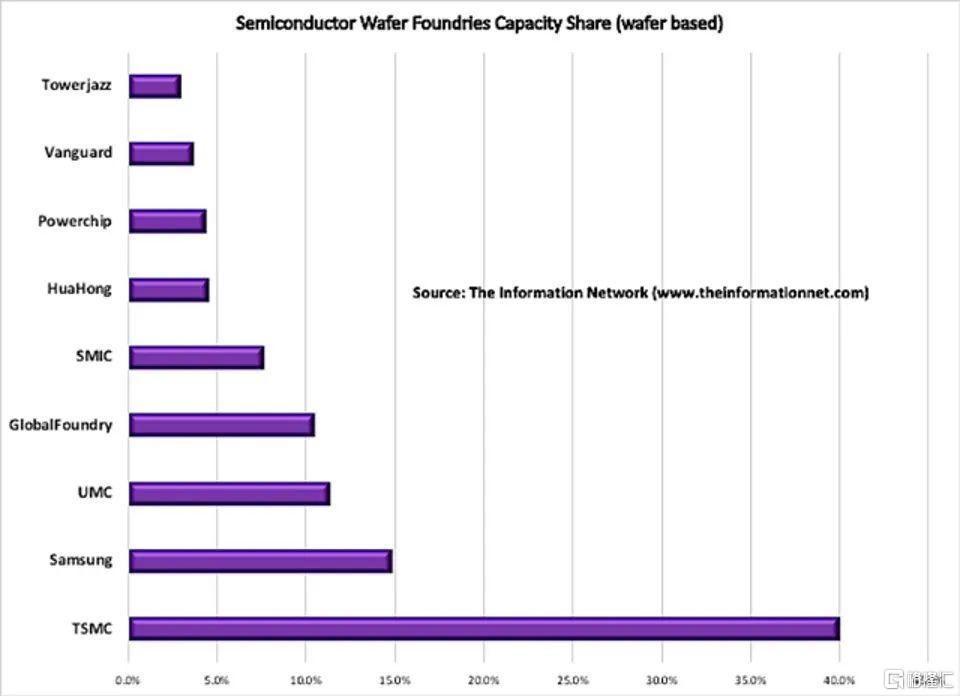 图3显示了基于晶圆的总产能份额(不是以上收入)。台积电占40%的份额。重要的是要注意,TSMC的55%的收入份额比基准的40%的份额高得多,这是因为其硅片的平均售价更高,这是因为其在较小节点上的均价较高,从而导致价格上涨。