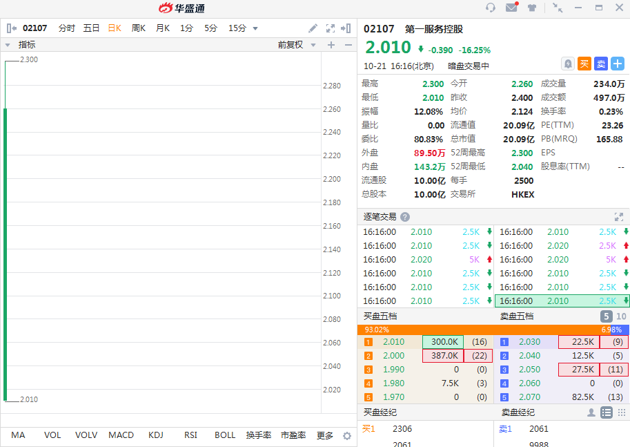 华盛资讯10月21日讯,第一服务(02107.HK)暗盘交易正在进行,截至发稿股价跌超16.25%,报价2.01港元,最新总市值20.09亿港元。该股公开配售申购人数95689人,一手中签率10%,认购倍数约66.69倍。国际配售中签人数161名,认购倍数约6.25倍。