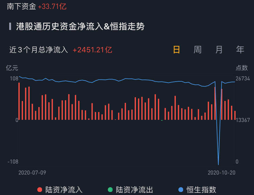 南下资金今日净流入港股33.71亿港元,流入规模较环比上升。