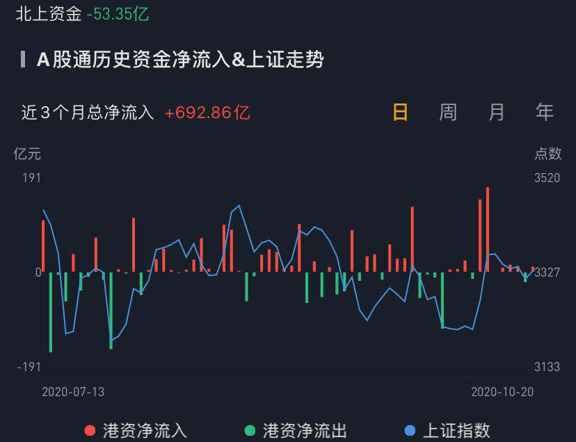 北上资金今日大幅净流出A股53.35亿元,流出规模骤然扩大。