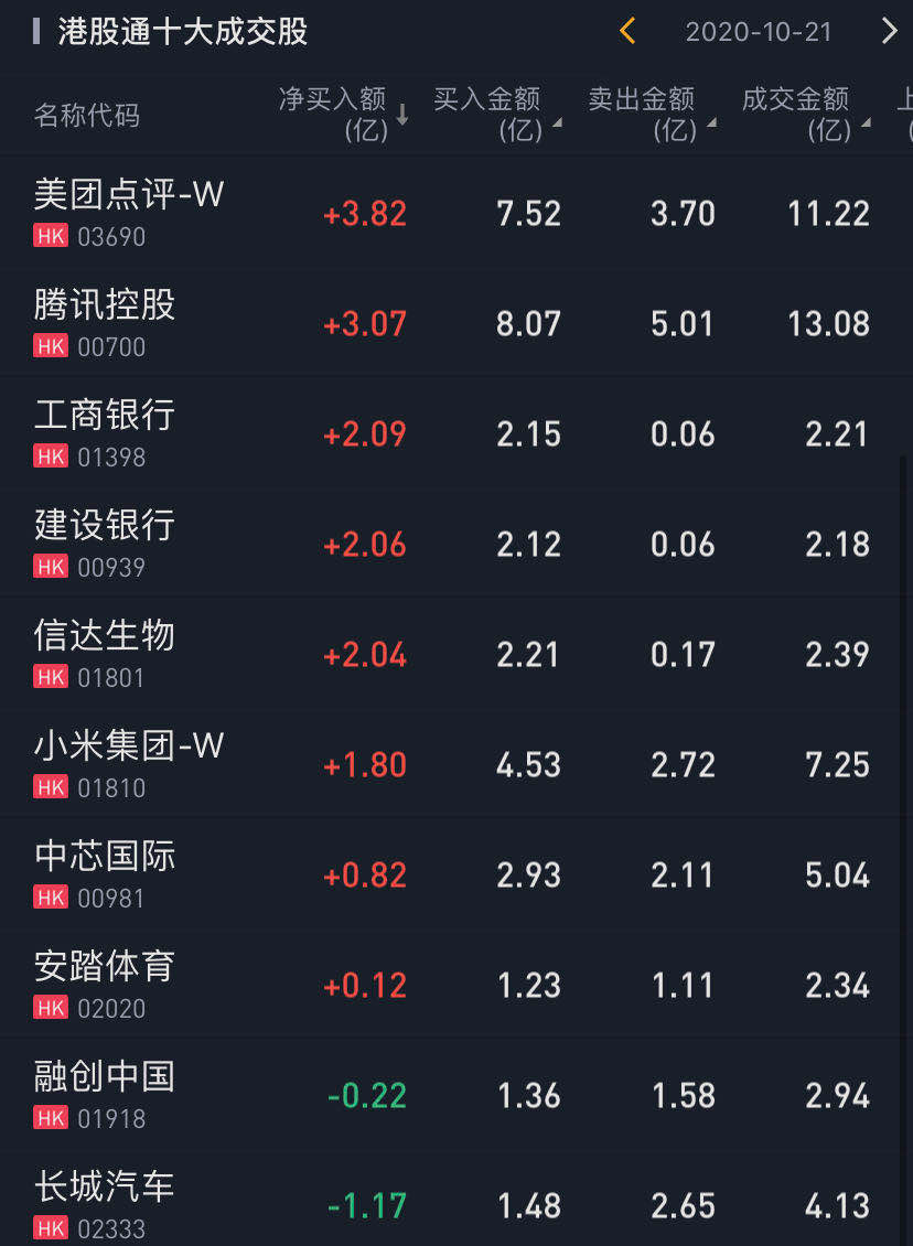 个股方面,今日南下资金净买入美团点评-W3.82亿港元,净买入腾讯控股3.07亿港元,净买入工商银行2.09亿港元,净买入建设银行2.06亿港元。